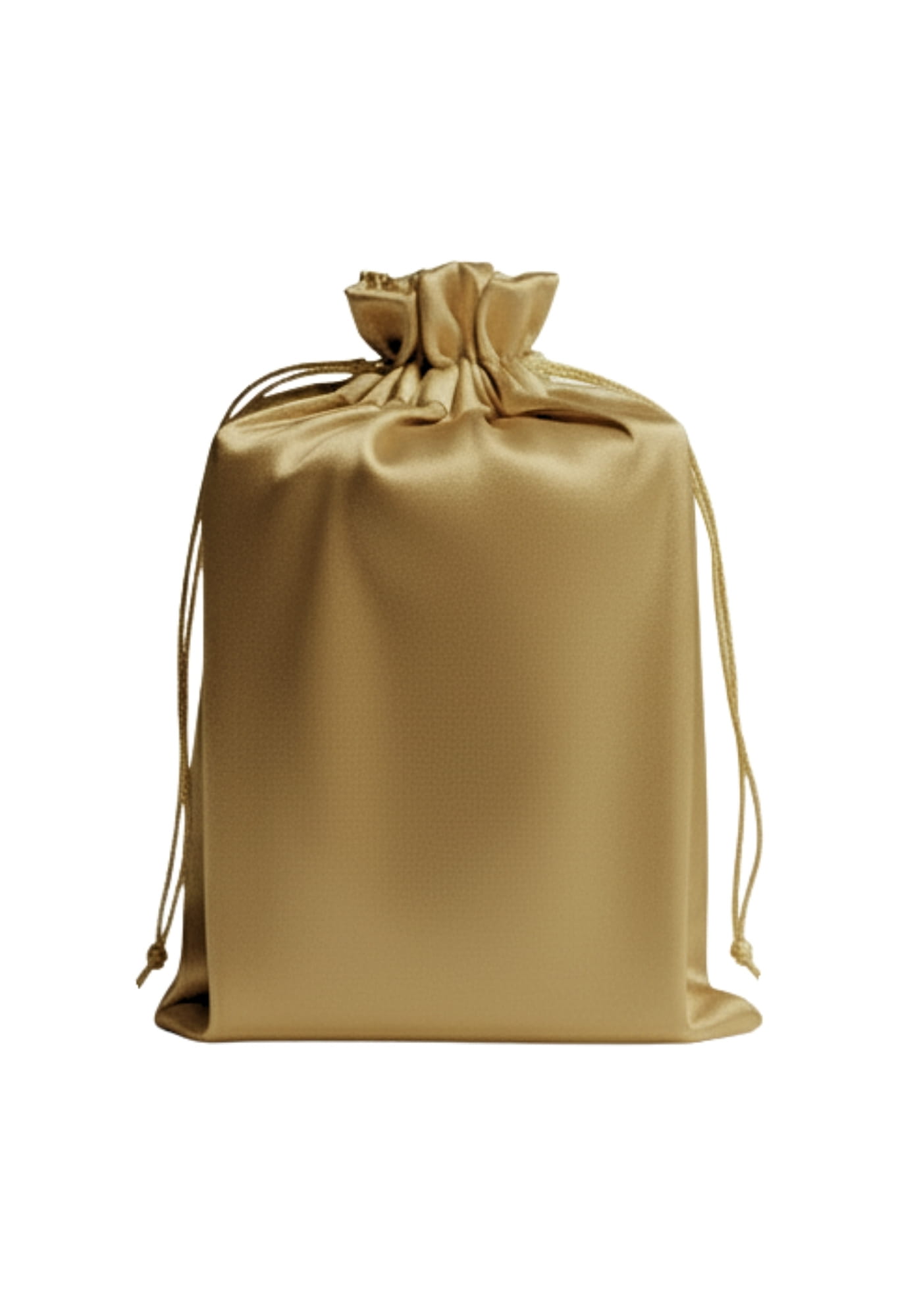 A stylish pouch made of shimmering satin in a golden hue, featuring a double drawstring closure – perfect for gift packaging.